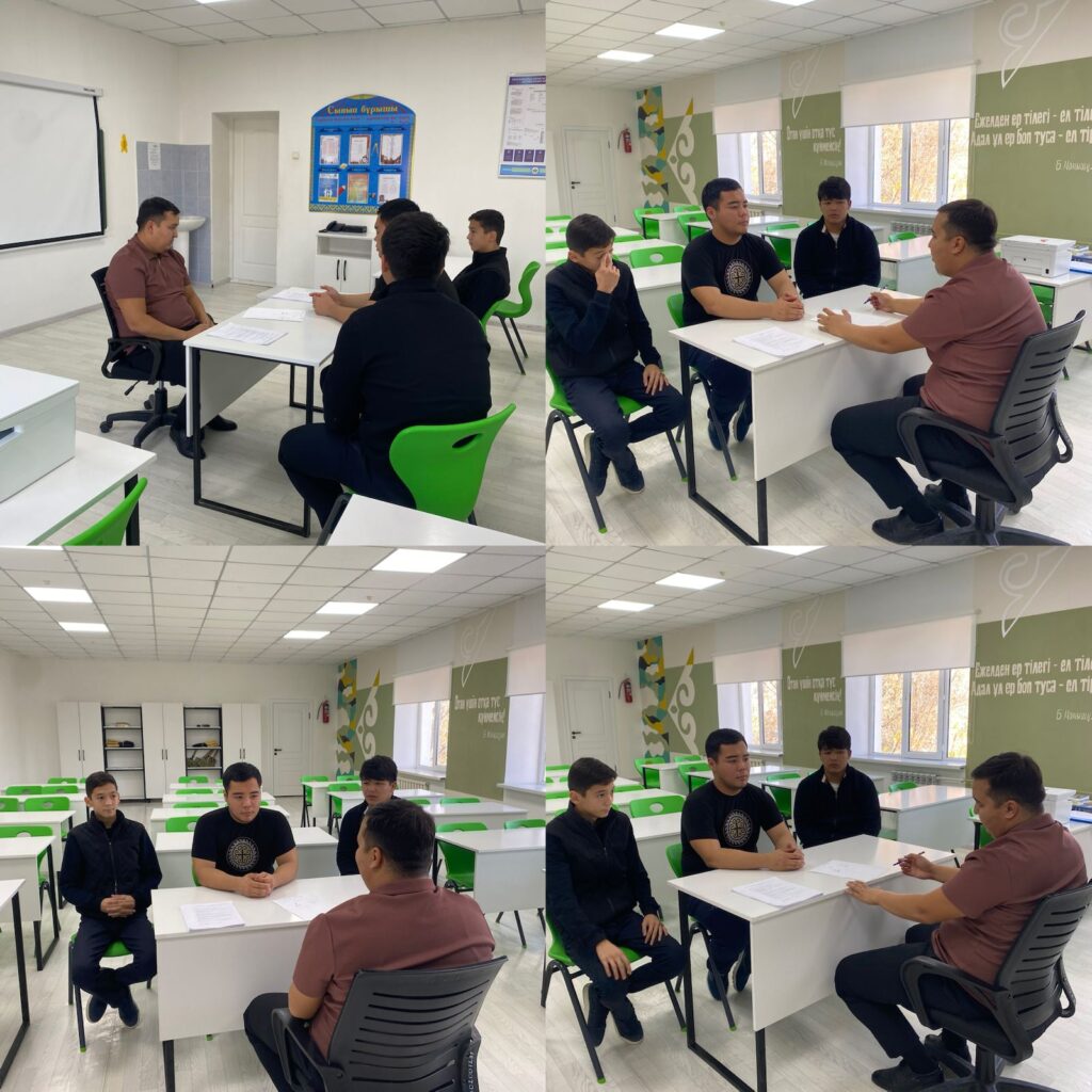 Кәсіптік бағдар беру бойынша 11сынып оқушыларымен жеке жұмыс жүргізілді. Мақсаты:оқушының қабілетін, қызығушылығын, бейімін анықтап, кәсіби бағыт-бағдар беру, болашақ мамандығын таңдауда көмектесу.