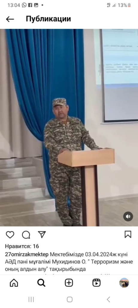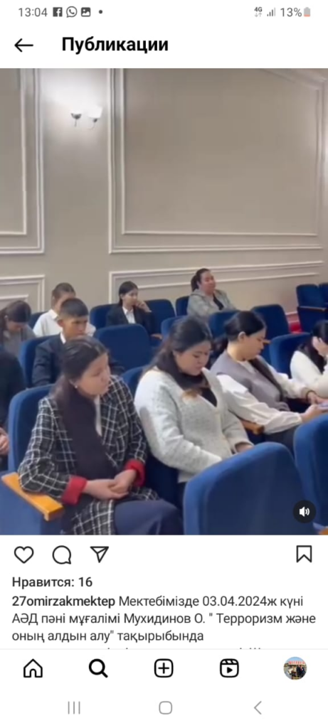 | Мектебімізде 03.04.2024ж күні АӘД пәні мұғалімі Мухидинов О. » Терроризм және оның алдын алу» тақырыбында ақпараттық-түсіндіру жұмыстары өтті. Шараға мектеп оқушылары мен ұстаздар қатысты. Терроризм жайында біраз ақпарат беріп, қалай сақтану керек жолдарын атап өтті. ДТЖО: Бисенова оқушыларға «Кибербуллинг және оның зардаптары» туралы оқушыларға түсінік жұмыстарын жүргізді |