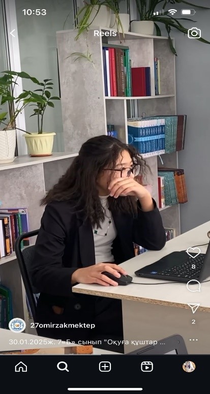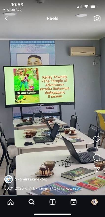7«Б» сынып «Оқуға құштар мектеп», «Балалар кітапханасы» жобасы, тілдер апталығы аясында Ағылшын тілі пәні мұғалімдері Сатыбалдиева Ж., Ә.Джайлхановамен бірлесе отырып, ағылшын тіліндегі көркем әдебиеттерді қызықтыру мақсатында желтоқсан айында өткен байқаудың II кезеңі ұйымдастырылды. Алдын ала байқауға қатысушы білім алушыларға Kelley Townley «The Temple of Adventure» кітабы оқуға ұсынылды, II кезеңде осы Kelley Townley «The Temple of Adventure» кітап бойынша Google форма арқылы дайындалған тест сұрақтары (30 минут) берілді.