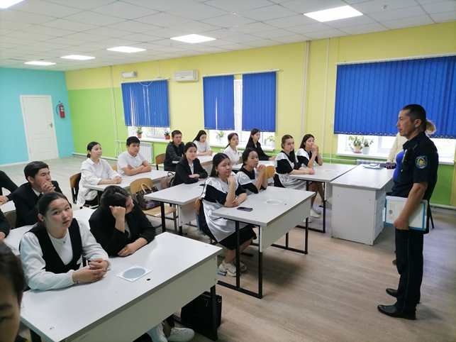 Мектебімізде 23.05.2024 ж. күні 10-11 сынып оқушыларына ювеналды полиция тобының учаскелік полиция инспекторы,полиция лейтенанты Асанбаев Е. «Жол ережесін білу, бәрімізге міндет» тақырыбында баяндама оқып, түсіндіру жұмыстарын жүргізді.10-11 сынып оқушыларына жазғы демалыс кезіндегі жол қауіпсіздігіне,су қауіпсіздігіне тоқталып өтті.